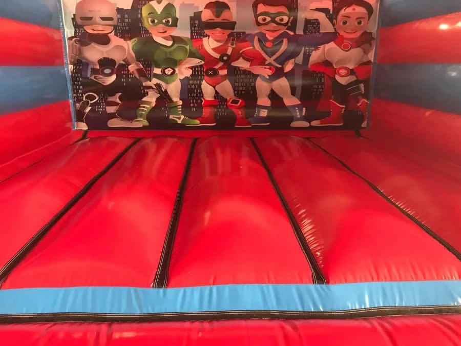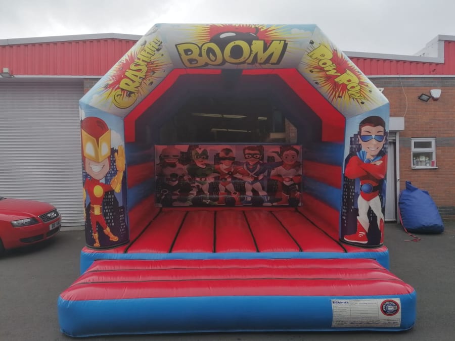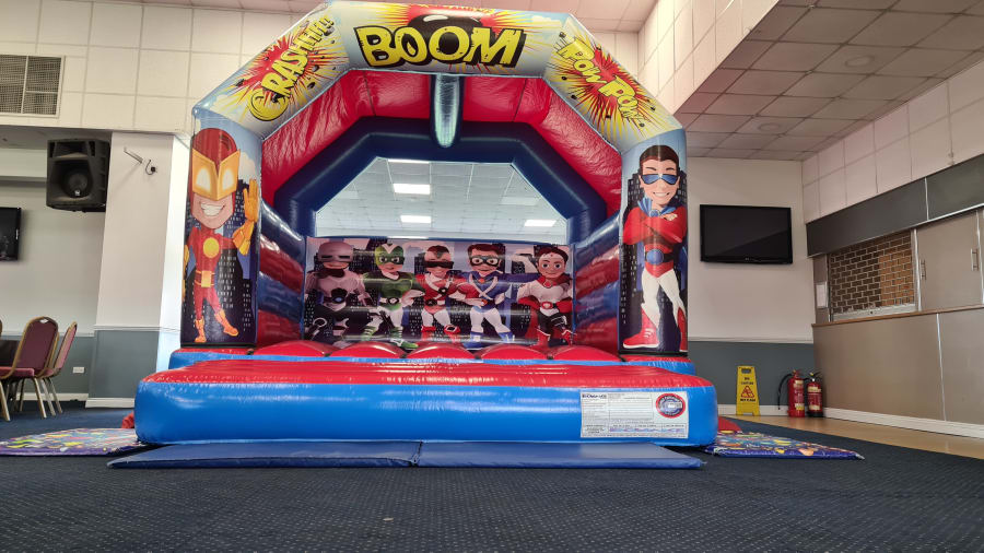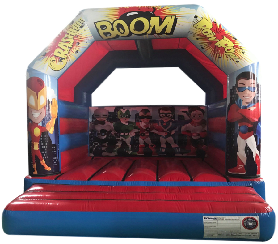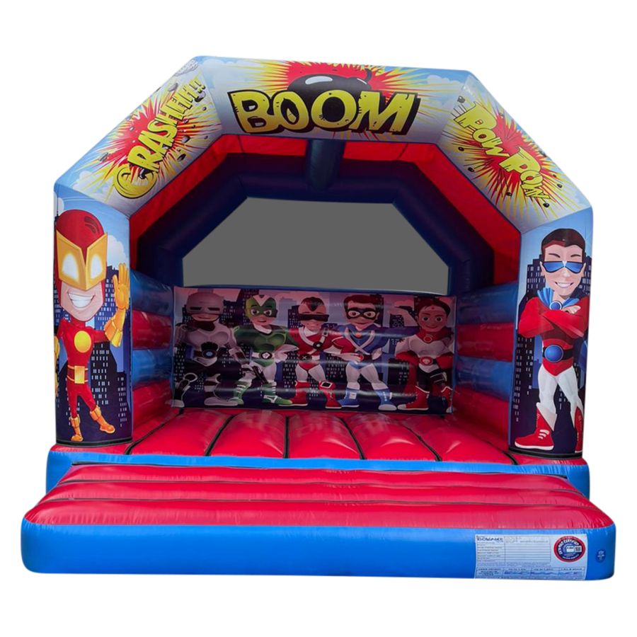 “BOOM” our super hero castle is here!! Perfect for a little ones superhero themed party. With the castle covered with cartoon superhero’s and comic words it’s sure to fit the theme.