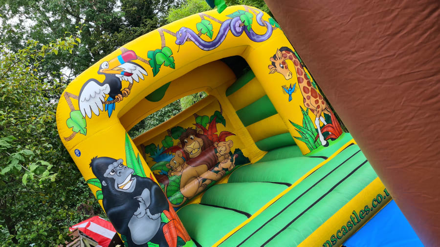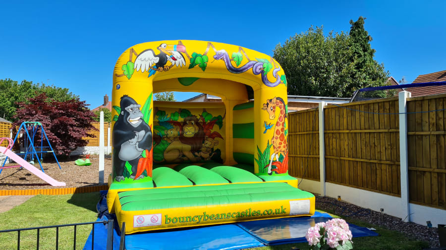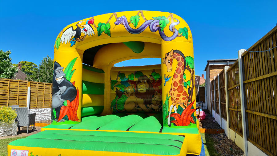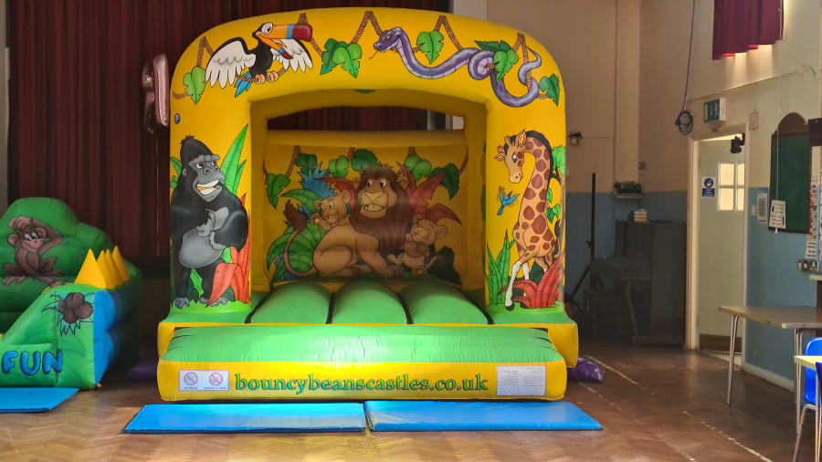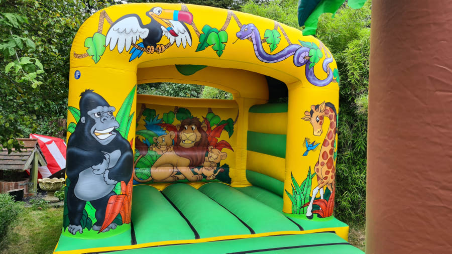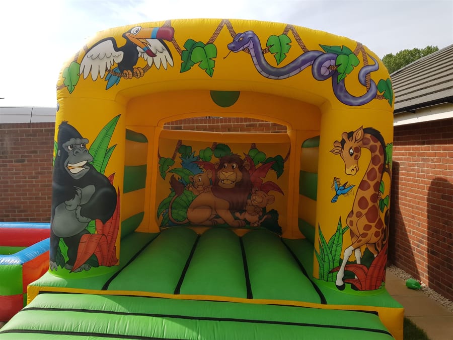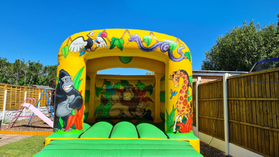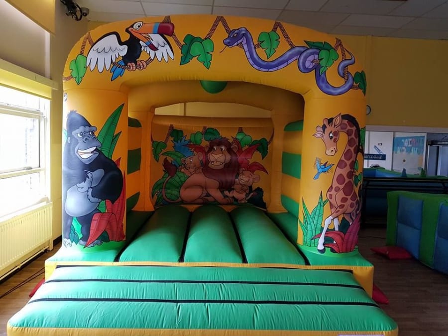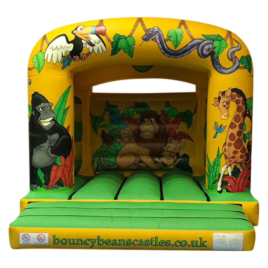 Our Jungle Theme Castle is perfect for any little one who loves the zoo! The castle is beautifully decorated with a variety of jungle creatures, ranging from a gorilla to a giraffe and more! The bright lime green bedding area is perfect for a group of little ones to bounce on all day long! Their is also a 7ft x 5ft x 4ft Jungle Theme Ball Pool which would match perfect with this 12ft x 12ft Jungle Theme Bouncy Castle. Contact Us if this is something you would be interested in.
